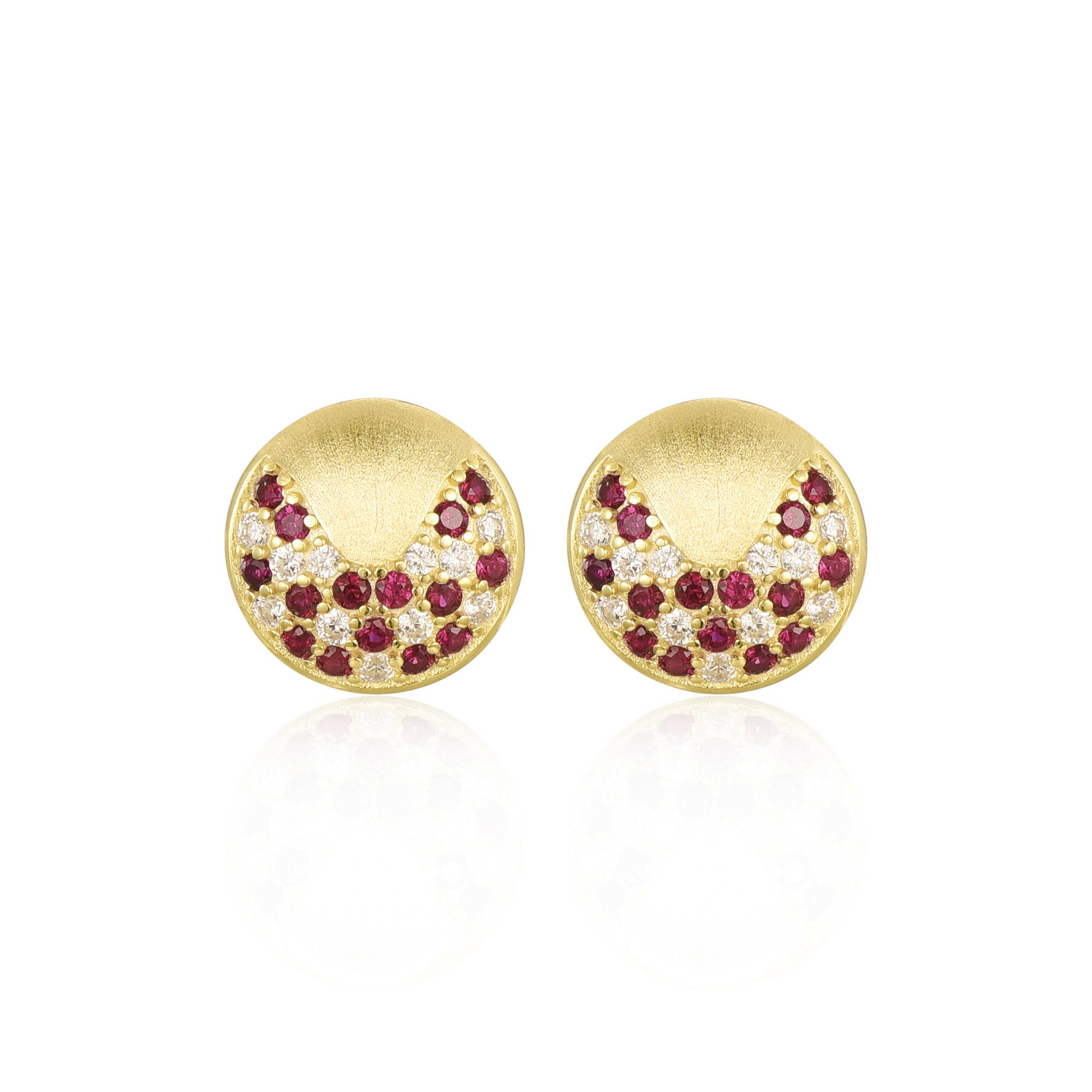 Add a touch of sophistication to your jewelry collection with these stylish brass stud earrings. Each earring has a round, brushed gold surface, detailed with vibrant red and clear rhinestones arranged in a unique crescent pattern. The secure post backing ensures comfortable and reliable wear all day long. Perfect for both everyday use and special occasions.