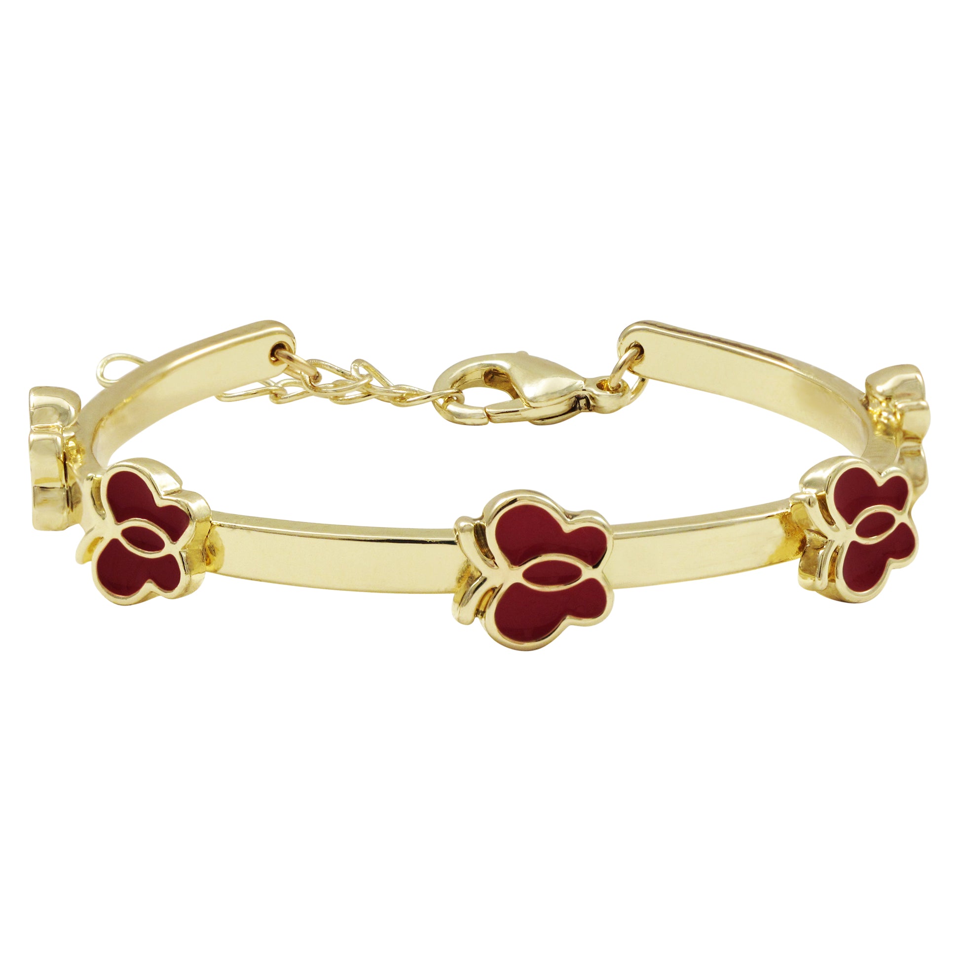Your little one will enjoy this red butterfly bangle is made with high quality materials . Gold plated over brass. Length 4.5"