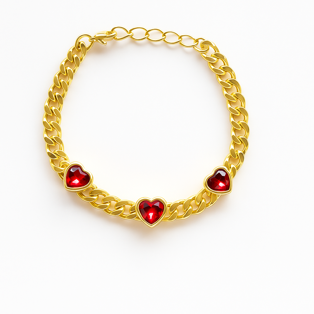 Elevate your style with this exquisite gold bracelet, crafted with a sleek curb chain that shines with a radiant polish. Adorned with three deep red, heart-shaped stones, this piece strikes the perfect balance between beauty and sophistication. A symbol of love and elegance, this bracelet is a must-have addition to any jewelry collection.