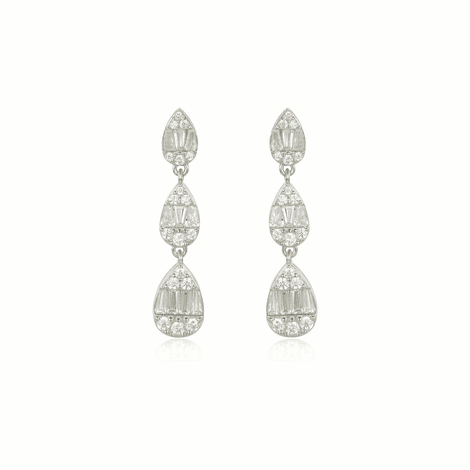 Add a touch of sophistication to your jewelry collection with these stylish sterling silver earrings. Each earring has 3 tiered teardrops , detailed with vibrant rhinestones arranged in a unique pattern. The secure post backing ensures comfortable and reliable wear all day long. Perfect for both everyday use and special occasions.